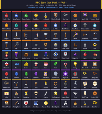 RPG Item Icon Pack Vol.1. 100 Pixel Art Icons (MV/MZ Ready)